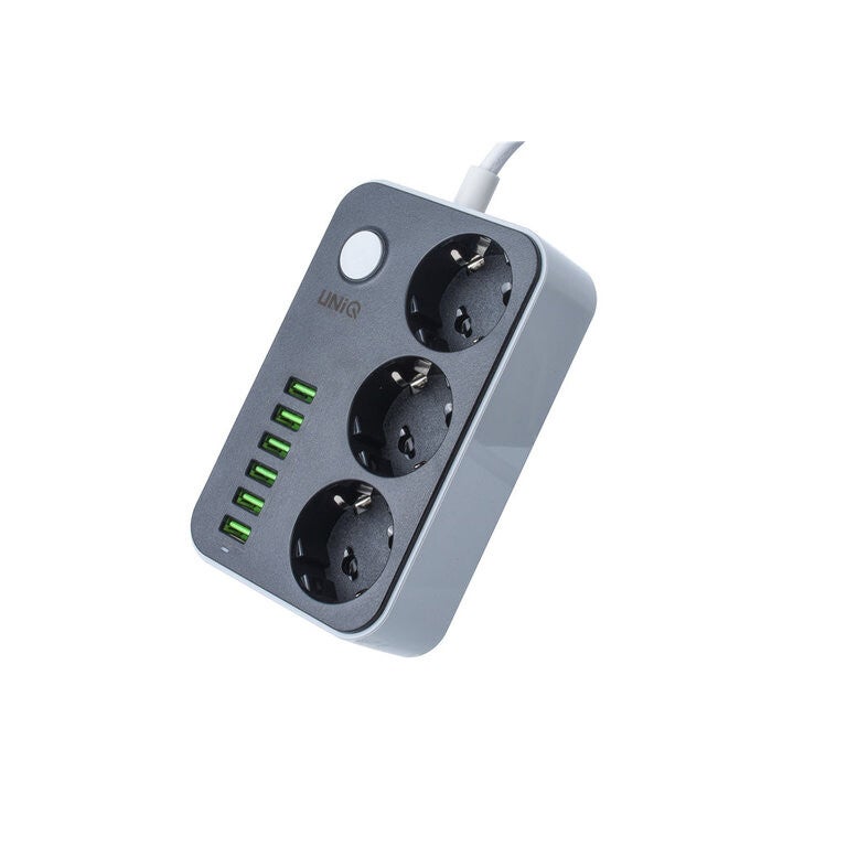 USB Hub uitgerust met Auto-ID identificatie, 6 USB-poorten en 3 stopcontacten voor het efficiënt opladen van verschillende digitale apparaten.